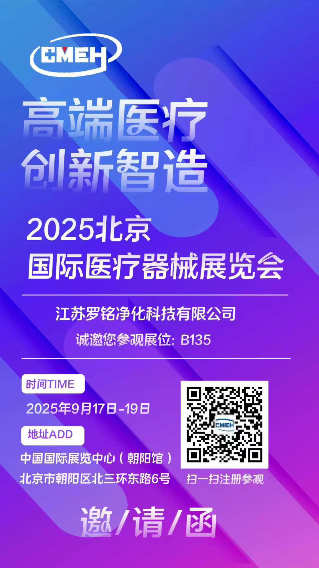 2025北京国际医疗器械展览会将为医疗器械行业带来一场精彩的盛宴。江苏罗铭净化科技有限公司期待在展会上与各界朋友交流合作,共同推动医疗净化技术的发展,为医疗安全保驾护航。